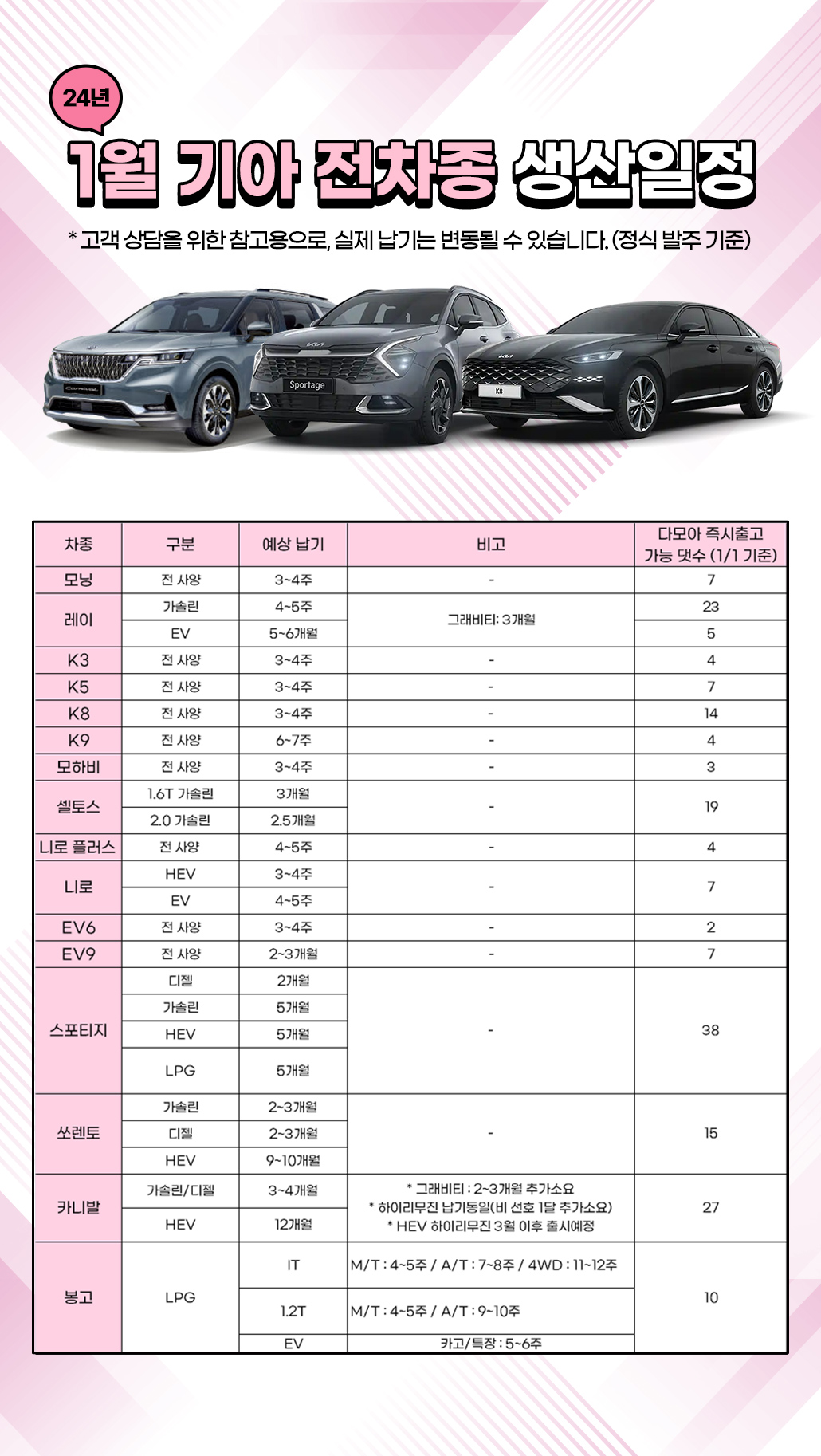 종료된 이벤트 01월 기아 생산일정 페이지 정보 작성자 관리자 댓글 0건 조회 4,187회 작성일 24-01-05 14:01 본문 24시 상담가능 [21개사 최저비교견적] 빠른상담신청 개인정보 취급방침 동의 목록 이전글BEST차종만 다~모아 할인! 24.02.15 다음글01월 현대 생산일정 24.01.05